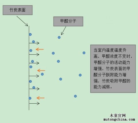 當環境中的溫度升高時,甲醛分子的活動能力增強,就會有更多的甲醛分子擺脫活性炭的吸附跑出來,竹炭的吸附能力就會下降。